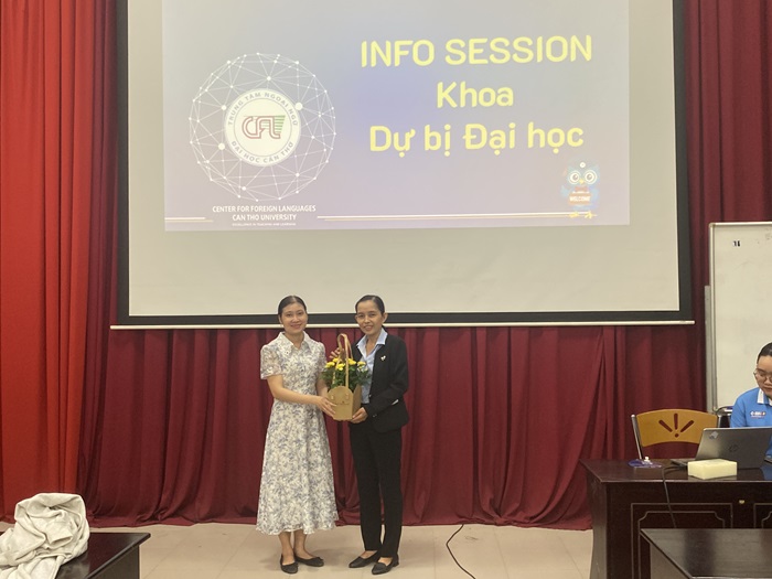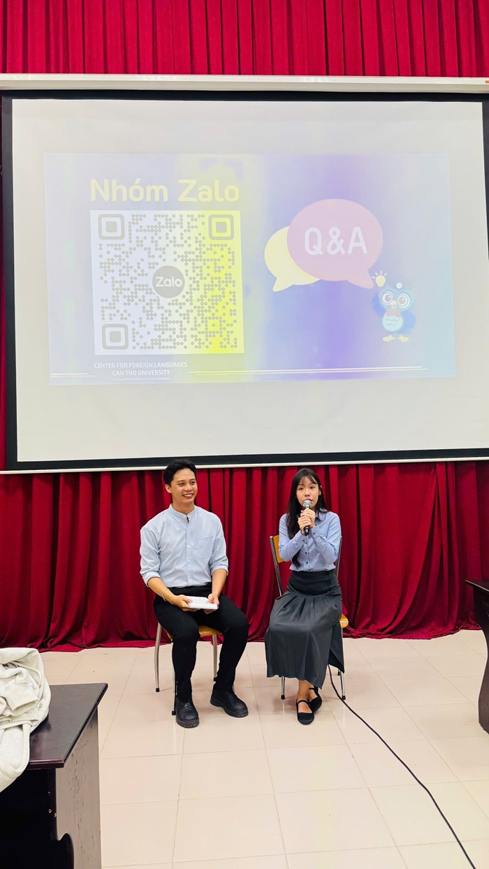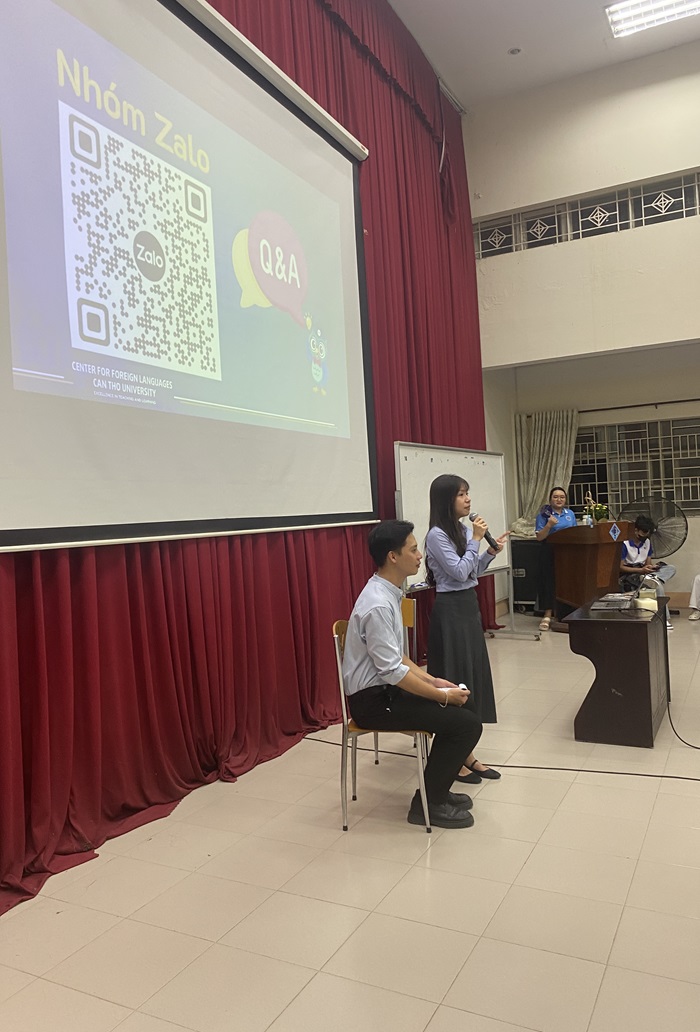 Đến với buổi tư vấn các em học sinh được nghe cô Trần Thị Thu Hiền trình bày lộ trình học tiếng Anh thông thường. Tiếp theo các bạn được giao lưu với các thầy cô về những kinh nghiệm để chinh phục môn tiếng anh khó nhằn, đặc biệt là bậc 3 và bậc 4 của chương trình Đánh giá năng lực ngoại ngữ. Ngoài ra các em còn được nghe tham gia đố vui từ các anh chị Trung tâm.